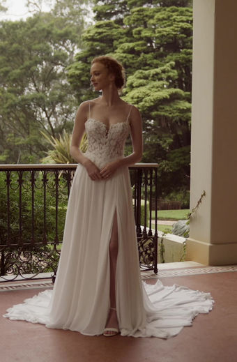 A bohemian dream from head to toe: introducing our beautiful Caitlin gown. This soft chiffon A-line gown is not only easy to move in, but she also is ultra-flattering, feels gentle on the skin, and flows behind one ever so gracefully. Caitlin's scoop neckline delicately frames one's decollétage and her sexy peekaboo allows for a touch of modern allure. Her embellished beaded spaghetti straps lead onto Caitlin's breathtaking low back. Caitlin's skirt slit adds a contemporary twist to the traditional A-line skirt and allows for ease of movement for the walk down the aisle. Say yes to the dress and celebrate true love in Caitlin!